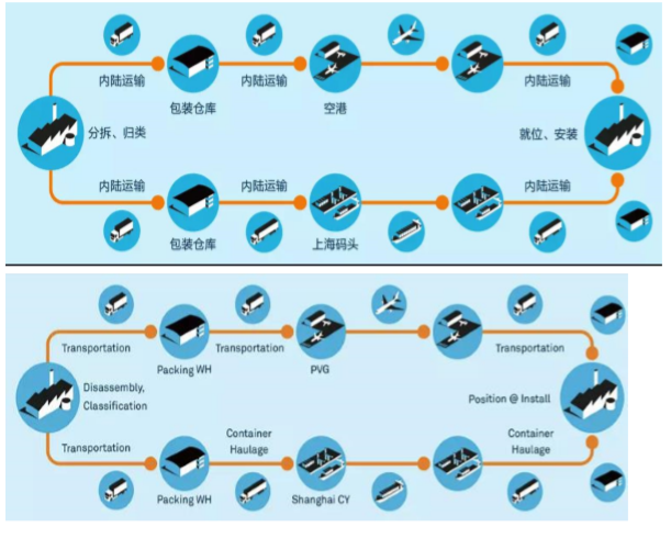 8、进库到中转仓库后,拆装以确认货物质量。根据客户指令运输至最终目的地工厂,进行就位和安装等操作。